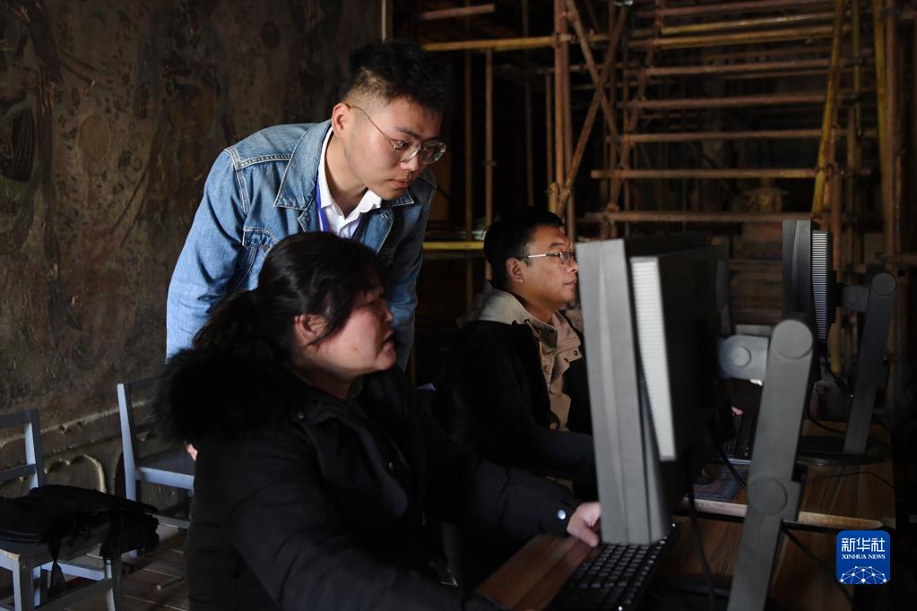 敦煌研究院文物數字化保護團隊圖像采集人員熊業(yè)騰(中)和同事在洞窟內查看剛剛采集到的圖片(4月25日攝)。