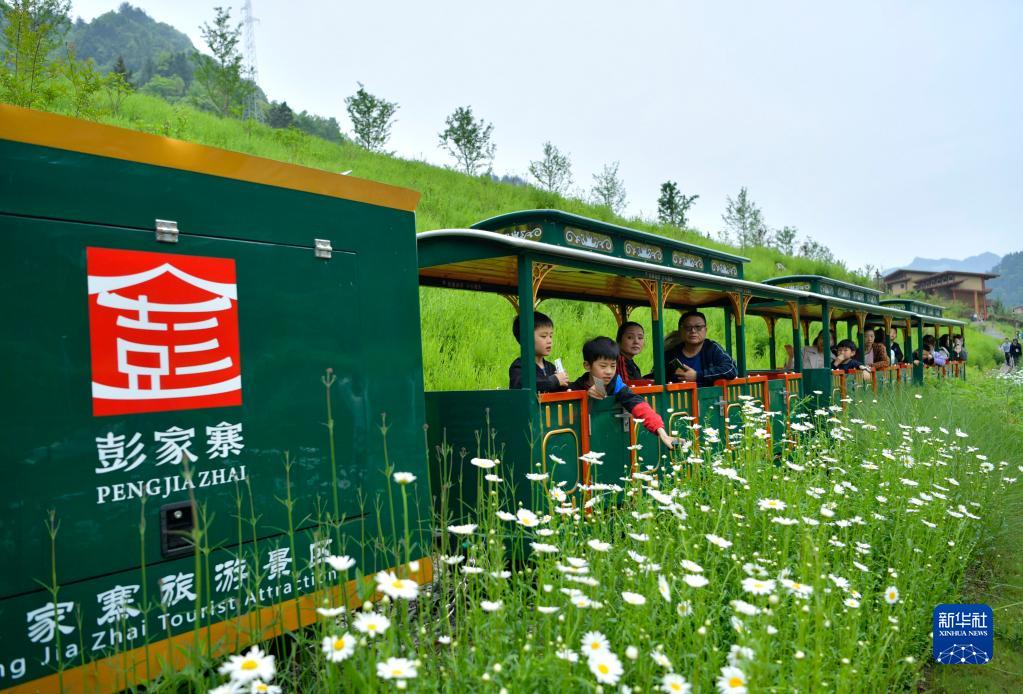 5月3日,游客在湖北省宣恩縣彭家寨古吊腳樓前體驗“小火車(chē)”。