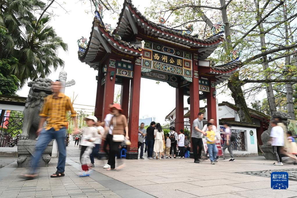 5月3日,游客在福州西湖公園游玩。