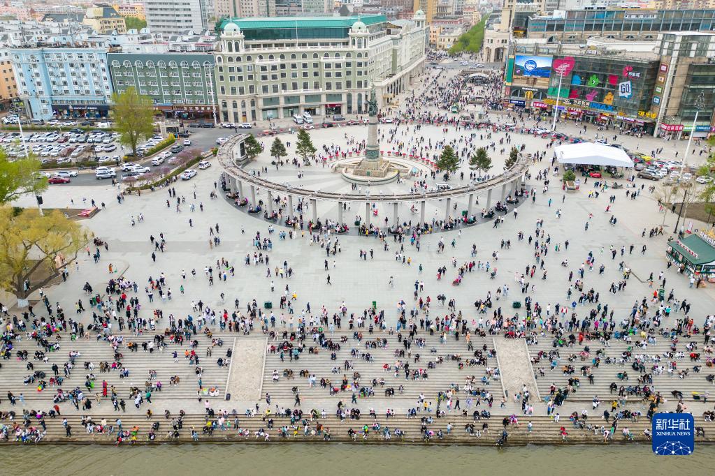 5月3日,人們在哈爾濱防洪紀念塔廣場(chǎng)游玩(無(wú)人機照片)。