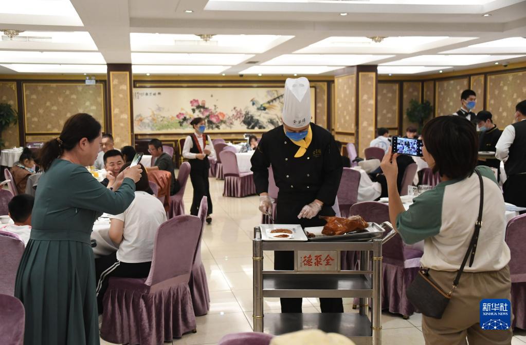 “五一”假期期間,在位于北京市東城區的全聚德王府井店,熱氣騰騰的烤鴨新鮮出爐,夏志鵬和其他烤鴨師熟練地片著(zhù)烤鴨,吸引顧客拍照留念。