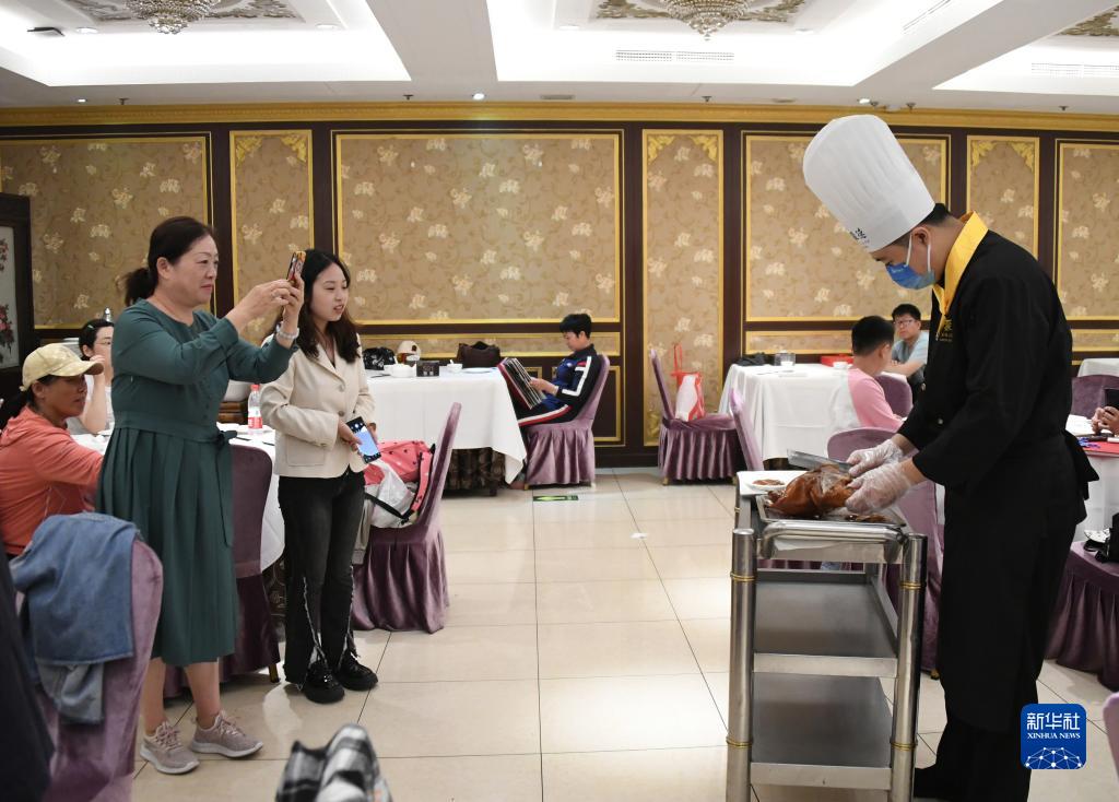 “五一”假期期間,在位于北京市東城區的全聚德王府井店,熱氣騰騰的烤鴨新鮮出爐,夏志鵬和其他烤鴨師熟練地片著(zhù)烤鴨,吸引顧客拍照留念。