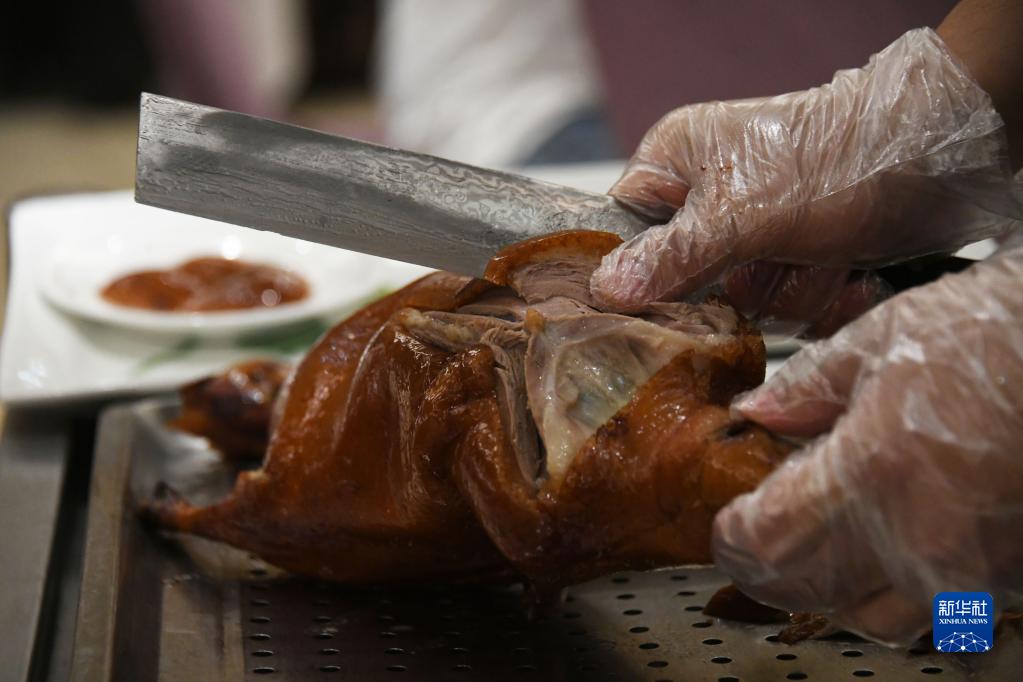 “五一”假期期間,在位于北京市東城區的全聚德王府井店,熱氣騰騰的烤鴨新鮮出爐,夏志鵬和其他烤鴨師熟練地片著(zhù)烤鴨,吸引顧客拍照留念。