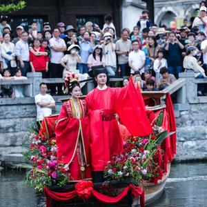當日,浙江省建德市梅城鎮嚴州古城舉行宋韻水上婚禮表演,通過(guò)出閣、梳妝、登船、親迎、禮拜的五幕演繹,吸引了人們駐足觀(guān)禮。有著(zhù)1000多年歷史的嚴州古城地處新安江、富春江、蘭江交匯處,歷史文化積淀深厚。