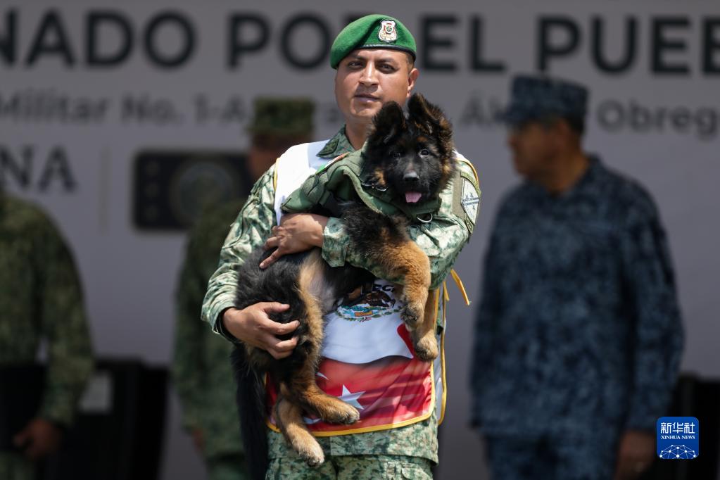 5月3日,在墨西哥瑙卡爾潘一處軍事基地,訓導員抱著(zhù)土耳其贈送的小狗。