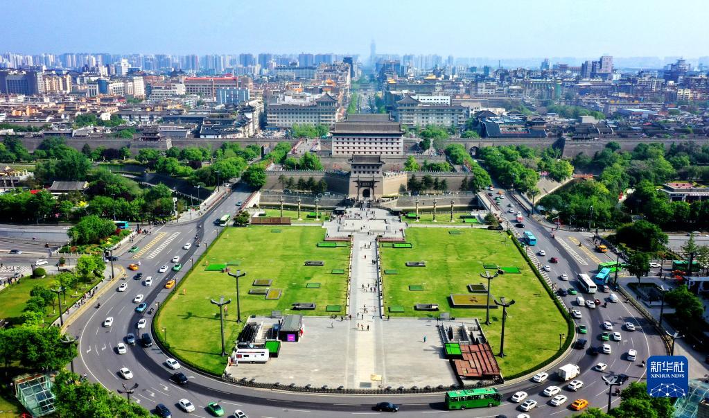 西安城墻景區永寧門(mén)文化廣場(chǎng)(4月25日攝,無(wú)人機照片)。