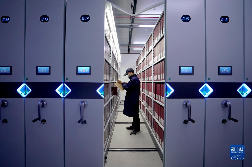 4月28日,在上海市檔案館的庫房?jì)?,保管部工作人員杜新慶在智能密集架間提取檔案。
