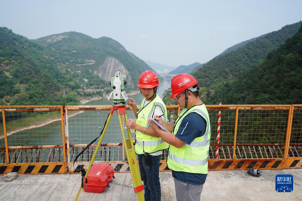 5月4日,在重慶市北碚區渝武高速復線(xiàn)觀(guān)音峽嘉陵江特大橋,中交一公局四公司橋梁工區工作人員孫培耕(右)和彭昭屏在對橋面高程及軸線(xiàn)偏位進(jìn)行測量。