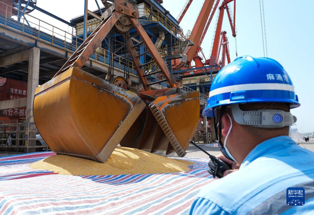 5月4日,首船進(jìn)口南非飼料玉米抵達廣東麻涌港后,工作人員指揮吊機從船上卸下玉米接受檢驗檢疫。