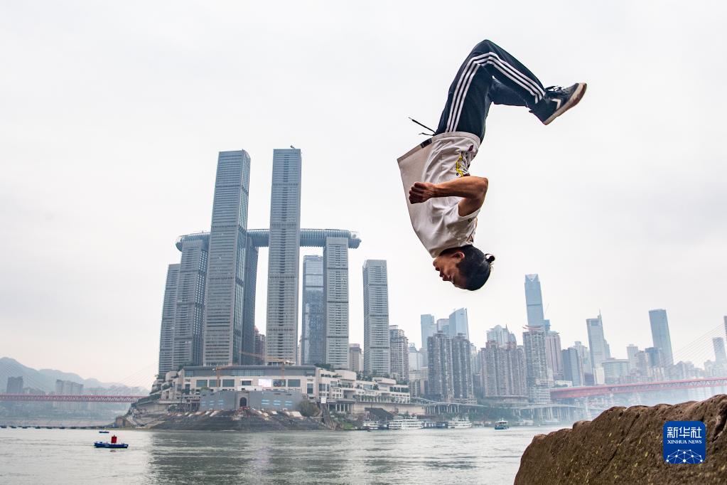 2023年4月21日,重慶躍飛跑酷隊員文舜堯在重慶朝天門(mén)對岸的江灘上展示跑酷動(dòng)作。