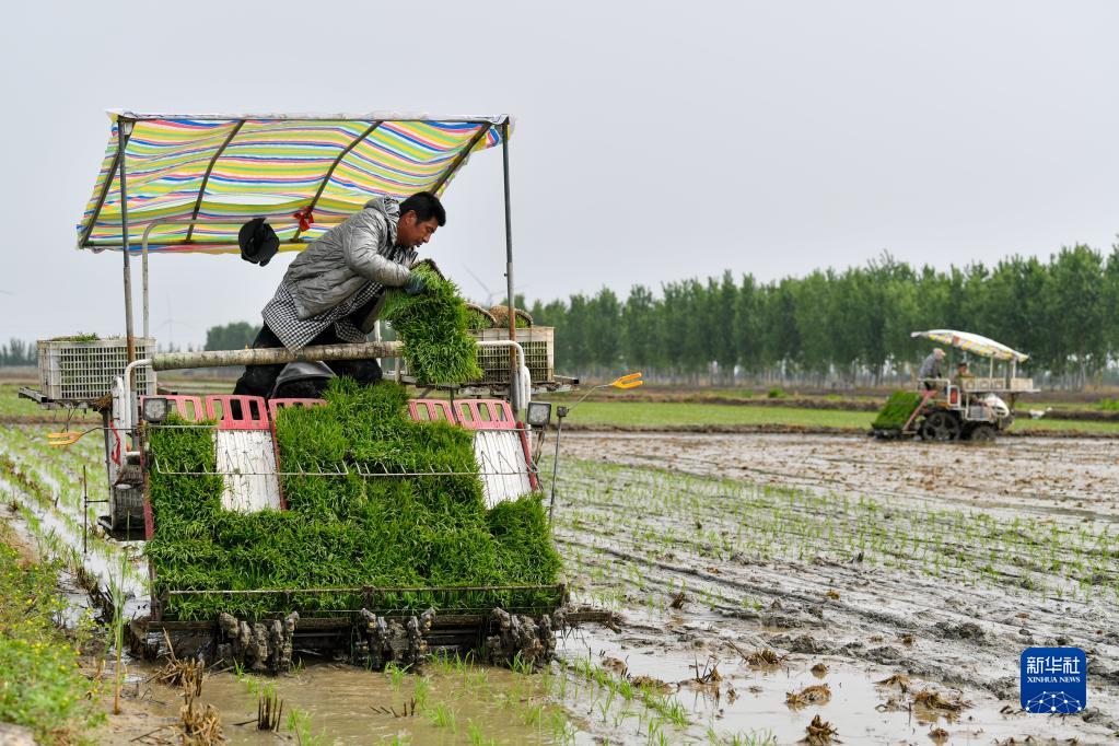 5月5日,在天津市寧河區東棘坨鎮,農民把秧苗放置到插秧機上。