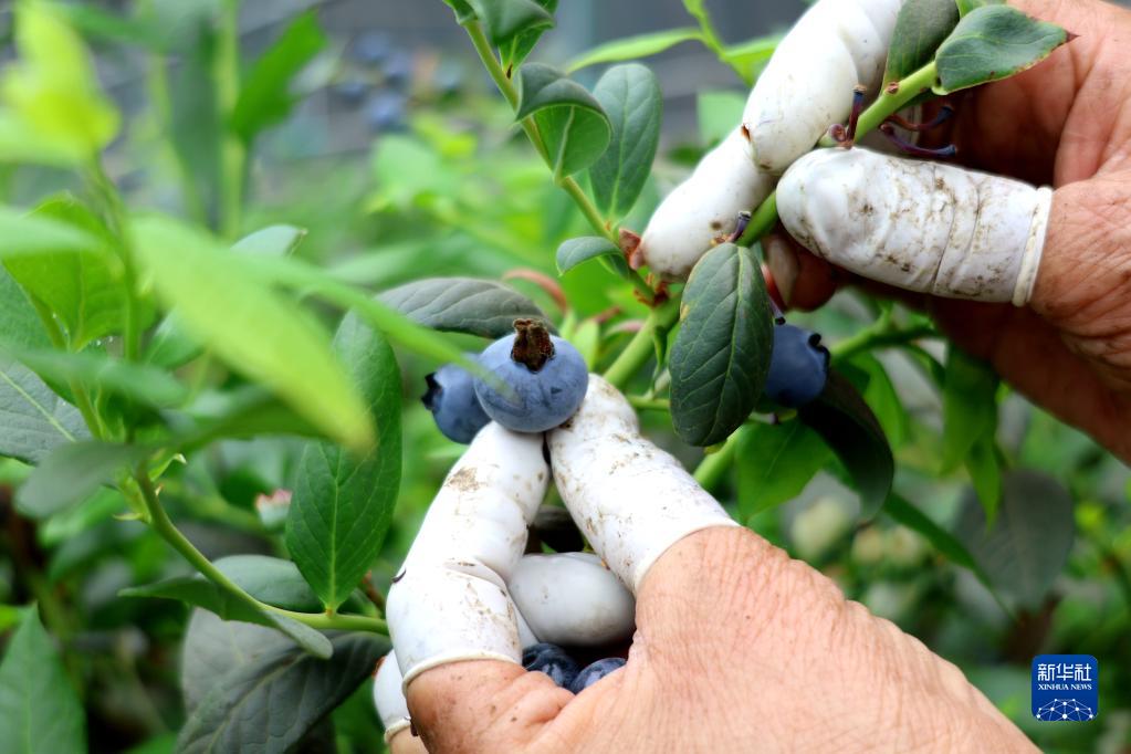 5月5日,山東省濱州市惠民縣淄角鎮農民在鄉村振興產(chǎn)業(yè)示范基地采摘藍莓。