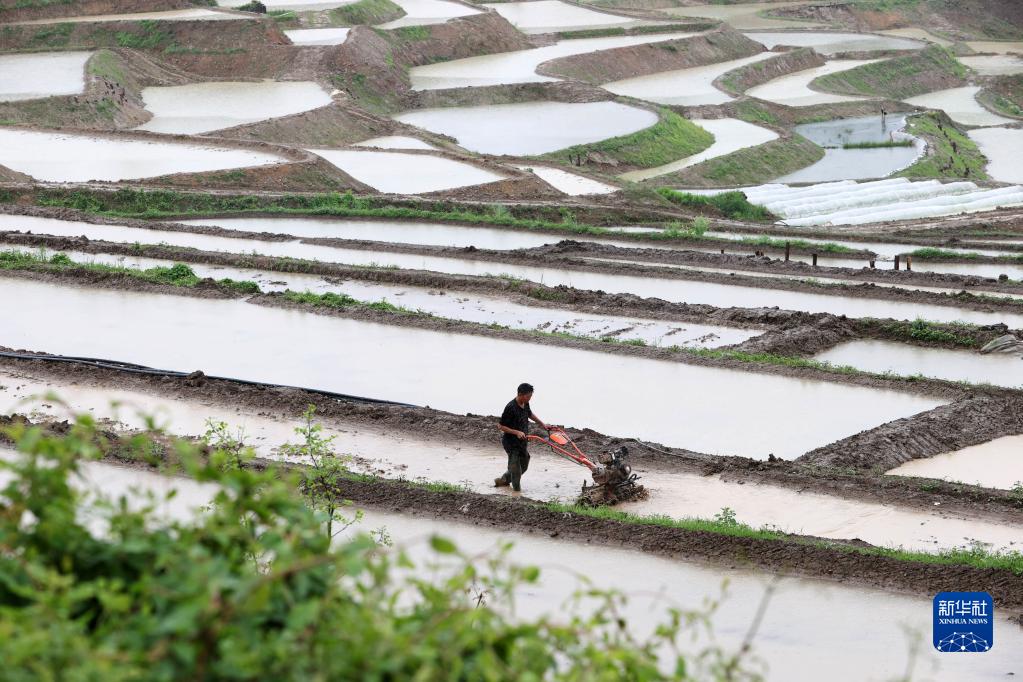 5月5日,重慶市黔江區鄰鄂鎮高坪村村民在整理梯田,為插秧做準備。