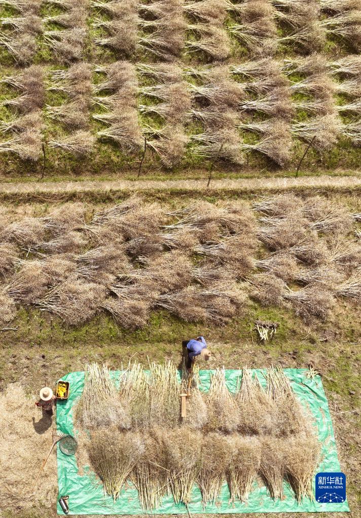 5月4日,在湖南省衡陽(yáng)市衡東縣楊林鎮,當地村民在采收油菜籽(無(wú)人機照片)。
