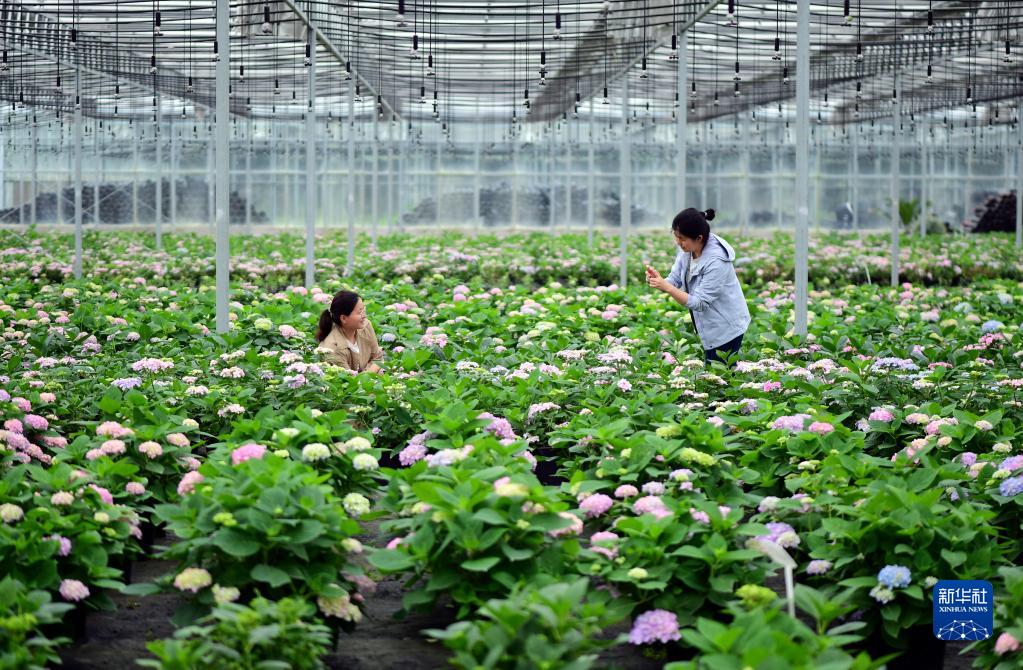 5月5日,在肥西縣經(jīng)開(kāi)區一家農林科技企業(yè),市民在花卉種植大棚內留影。