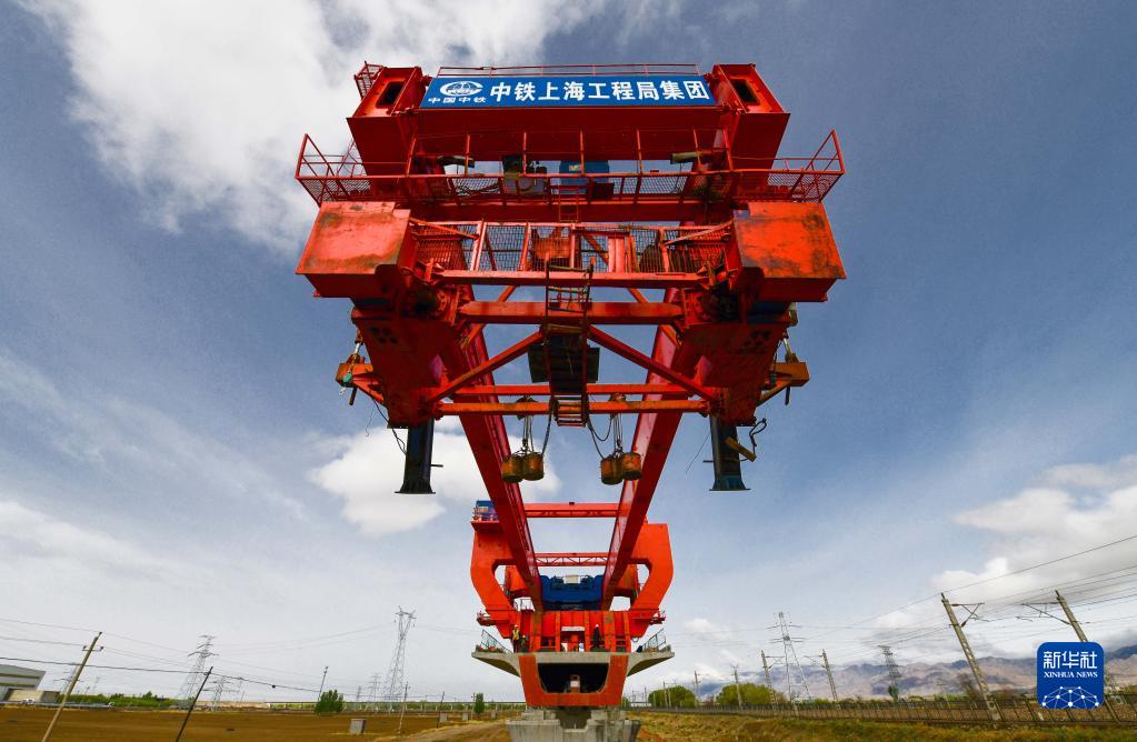 5月5日拍攝的包銀高鐵跨萬(wàn)甘鐵路特大橋箱梁架設施工現場(chǎng)。