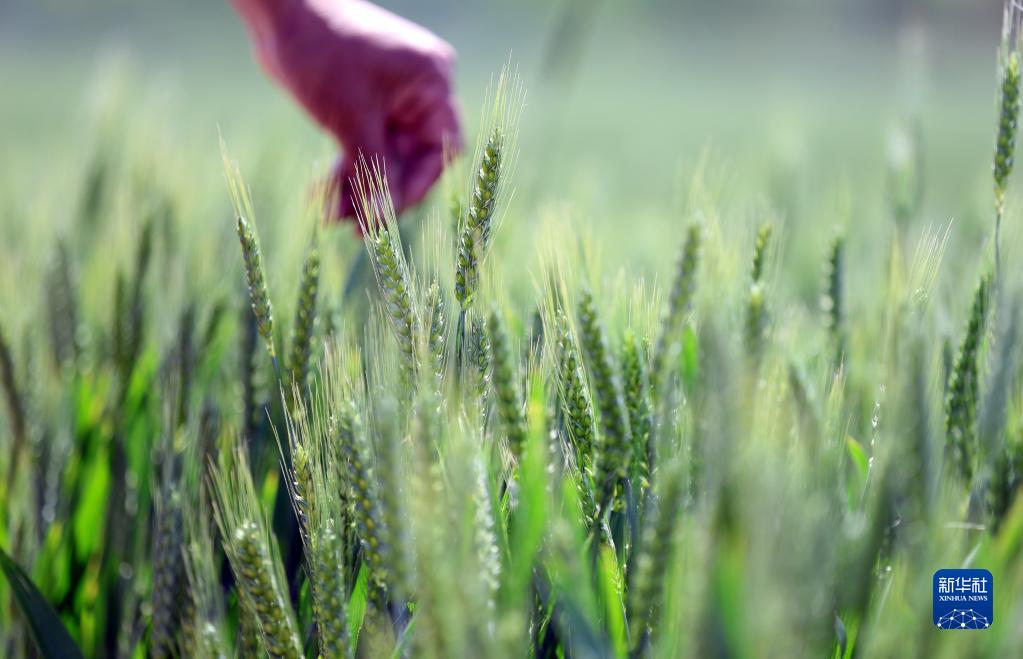 5月6日,山東省臨沂市郯城縣郯城街道的農民在查看小麥長(cháng)勢。