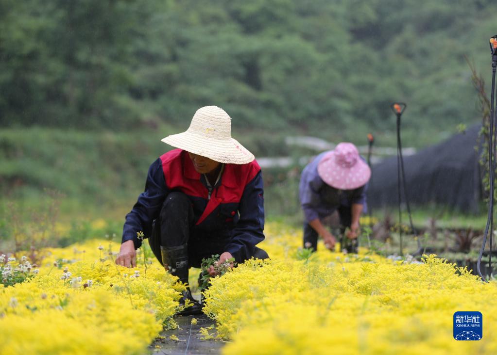 5月6日,在貴州省貴陽(yáng)市開(kāi)陽(yáng)縣云開(kāi)街道石頭村花卉種植基地,花農在管護鮮花。