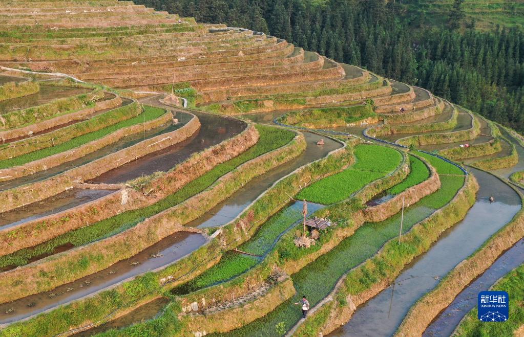 5月6日,農民在貴州省從江縣加榜鄉加頁(yè)村的梯田勞作(無(wú)人機照片)。