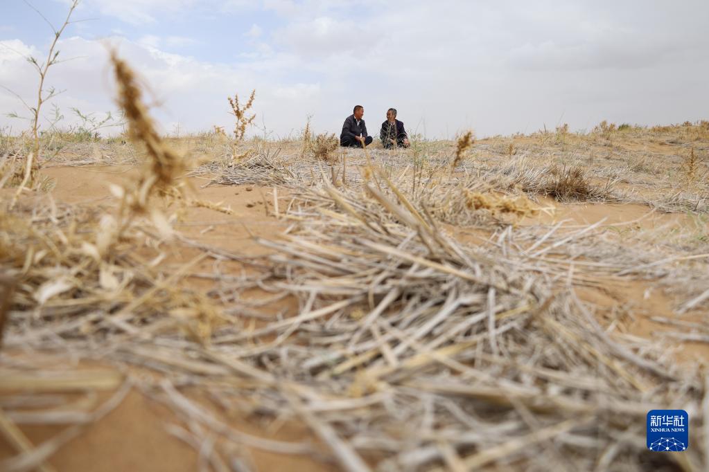 5月6日,第二代治沙人郭萬(wàn)剛(右)和石銀山在古浪縣的一片治沙區觀(guān)察治沙情況。新華社記者 馬希平 攝