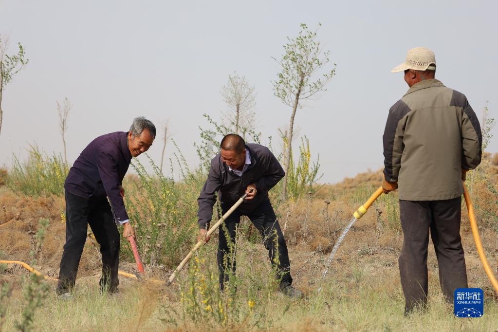 5月6日,第二代治沙人郭萬(wàn)剛(左)和石銀山(中)在古浪縣的一片治沙區與林場(chǎng)職工一起勞作。新華社記者 馬希平 攝