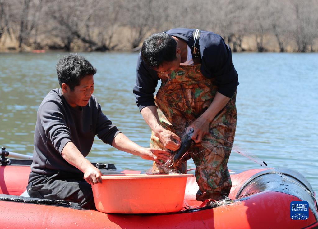5月7日,養殖基地工作人員在放養區打撈細鱗鮭。