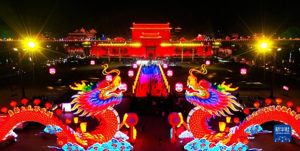2023年春節期間西安城墻永寧門(mén)的花燈(1月26日攝,無(wú)人機照片)。