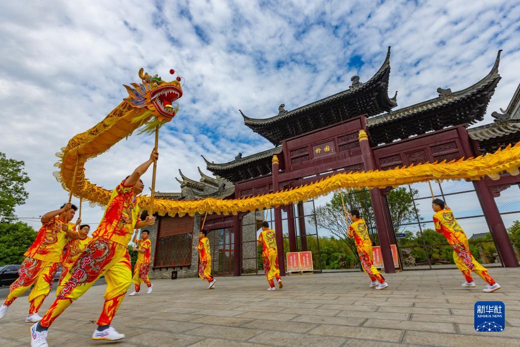 5月7日,江蘇省級非遺項目丁伙龍舞表演隊在江蘇省揚州市江都區丁伙鎮樸園表演。