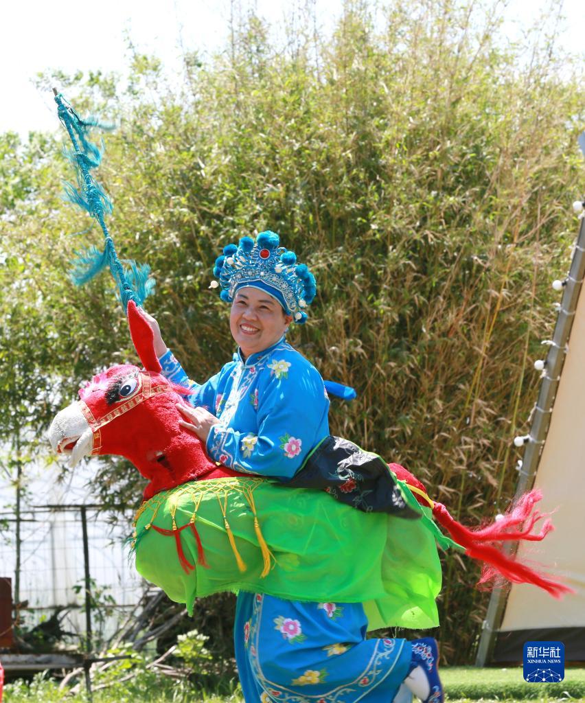 5月7日,江蘇省級非遺項目吳橋社火表演隊在江蘇省揚州市江都區吳橋鎮白塔河生態(tài)度假莊園為游客表演。