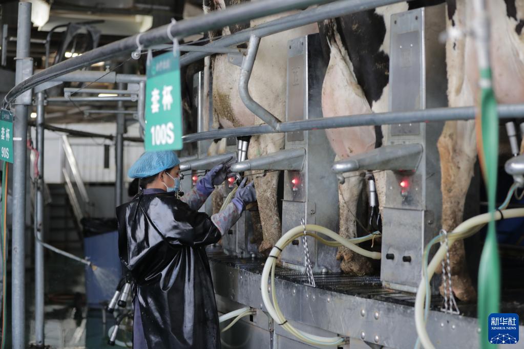 5月7日,在甘肅武威金宇浩睿農牧產(chǎn)業(yè)園,工作人員在轉盤(pán)式擠奶機旁工作。