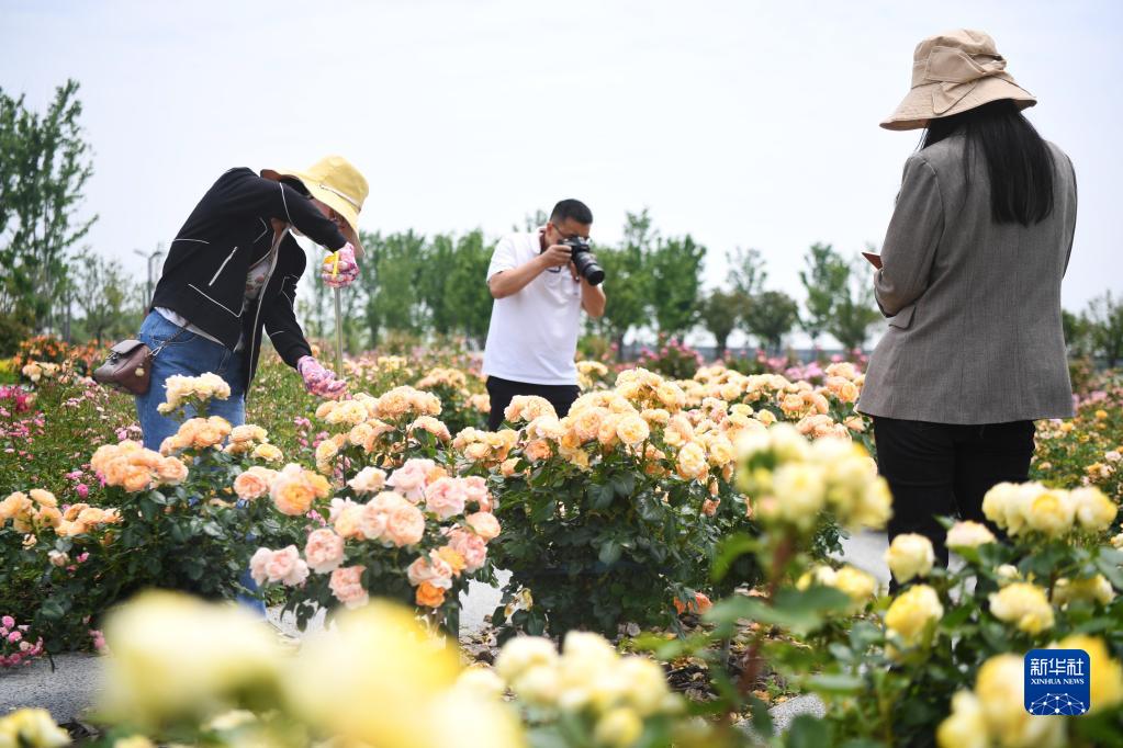 5月8日,在南陽(yáng)市月季國家林木種質(zhì)資源庫,工作人員在做月季特性調查。