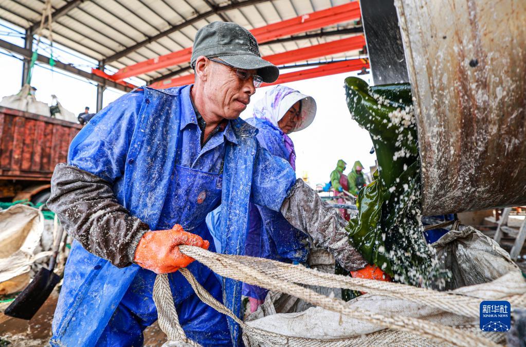 眼下,山東省榮成市正值海帶采收、加工旺季,養殖工將采收的海帶運到鹽漬海帶生產(chǎn)車(chē)間進(jìn)行加工。
