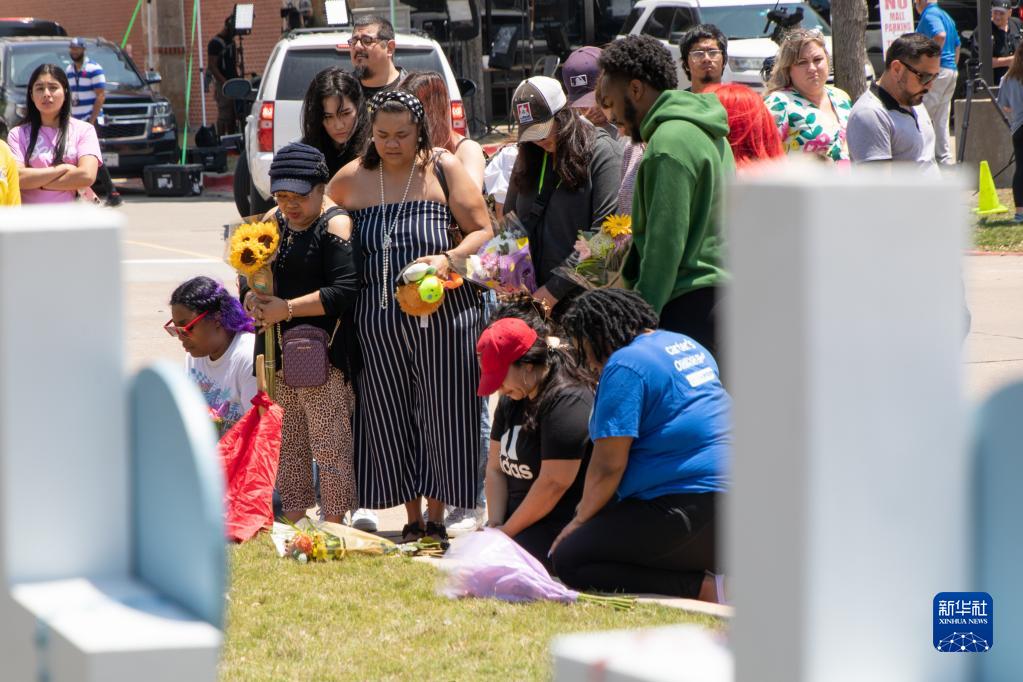 5月8日,在美國得克薩斯州達拉斯以北城鎮艾倫,人們在購物中心槍擊事件現場(chǎng)附近悼念受害者。