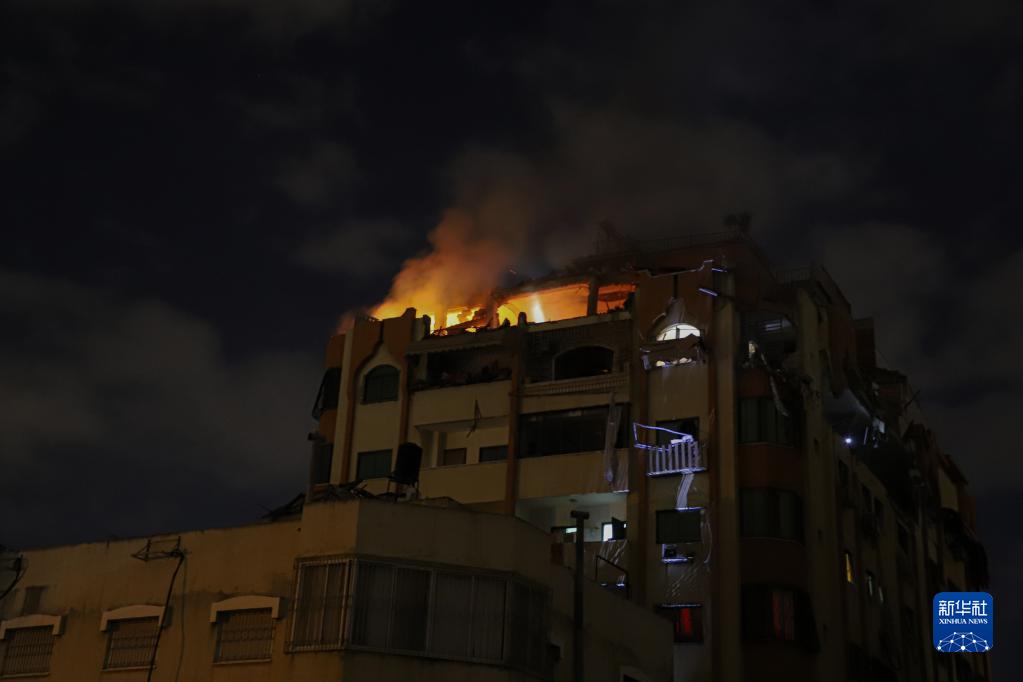 這是5月9日在加沙城拍攝的遭到空襲后失火的建筑。
