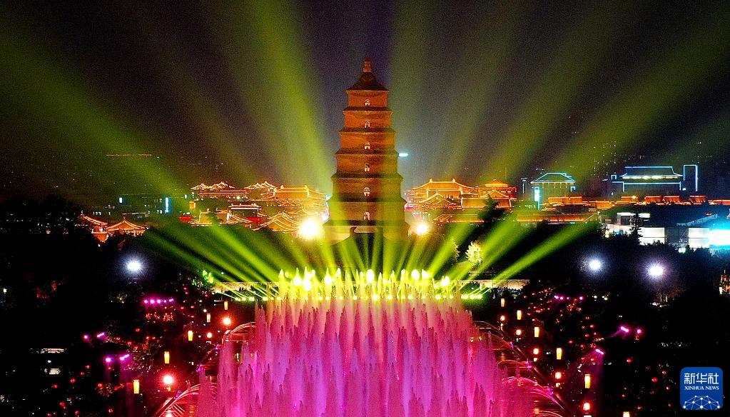 西安大雁塔北廣場(chǎng)在進(jìn)行音樂(lè )噴泉表演(4月18日攝,無(wú)人機照片)。