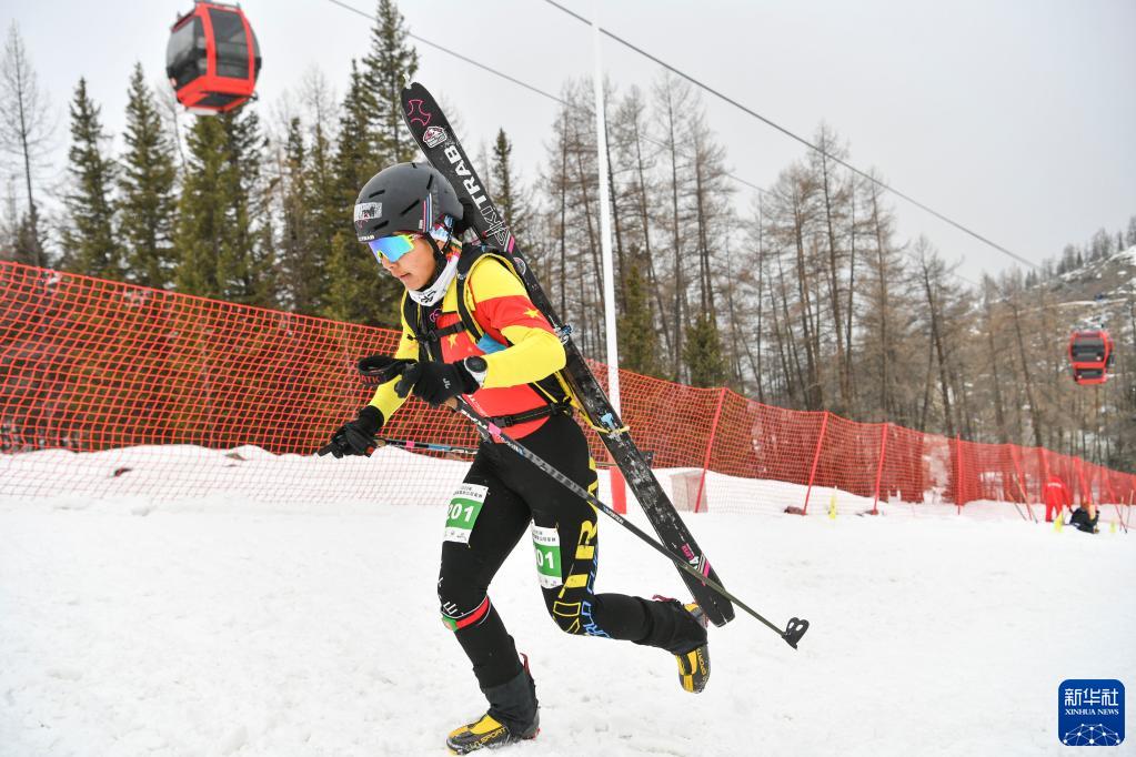 在新疆富蘊縣可可托海國際滑雪度假區,玉珍拉姆參加全國首屆滑雪登山冠軍賽短距離(女子組)比賽(4月8日攝)。新華社記者 胡虎虎 攝