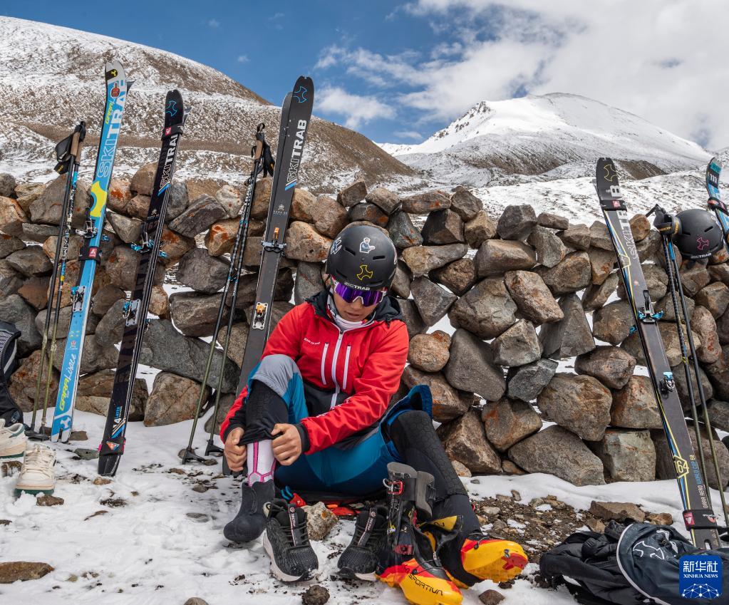 在西藏拉薩市當雄縣羊八井鎮,玉珍拉姆穿戴訓練裝備(5月2日攝)。新華社記者 孫非 攝