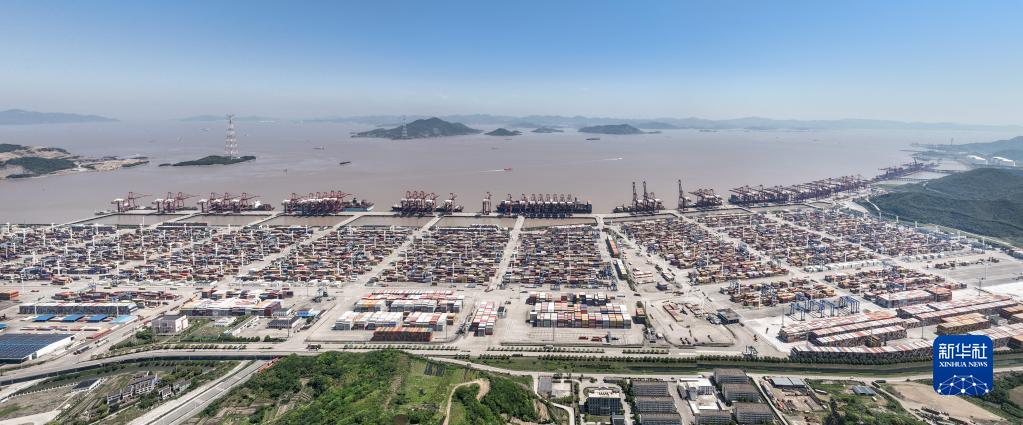 5月9日拍攝的寧波舟山港穿山港區(無(wú)人機全景照片)。