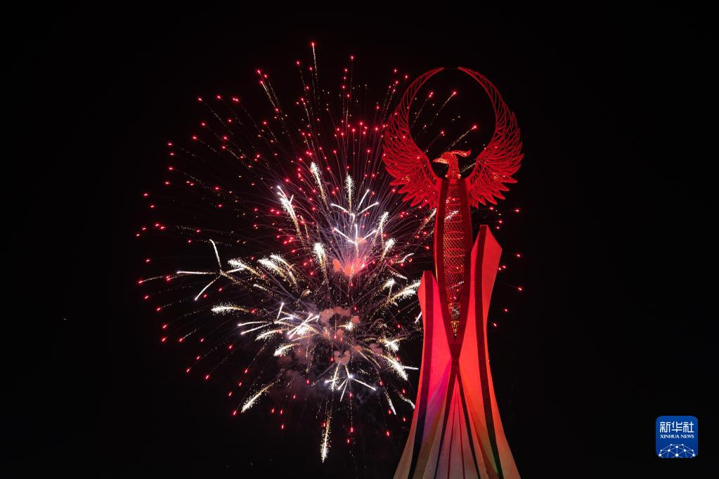 5月9日,煙花在烏茲別克斯坦首都塔什干上空綻放,慶?!凹o念和榮譽(yù)日”。