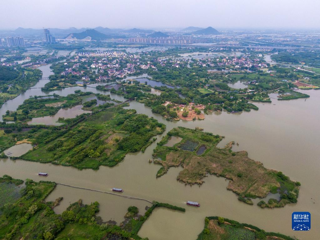 空中俯瞰位于德清縣的下渚湖國家濕地公園(5月8日攝,無(wú)人機照片)。下渚湖國家濕地公園面積約為36平方公里,是國家AAAA級景區、省級風(fēng)景名勝區、朱鹮易地保護暨浙江種群重建基地、國家野生大豆保護區、省級生態(tài)旅游示范區試點(diǎn)單位。
