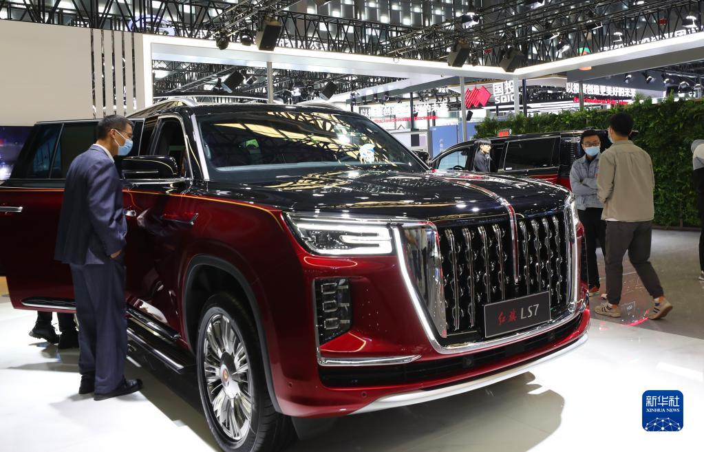 5月10日,參觀(guān)者在紅旗汽車(chē)展臺上的一輛紅旗LS7汽車(chē)旁駐足觀(guān)看。