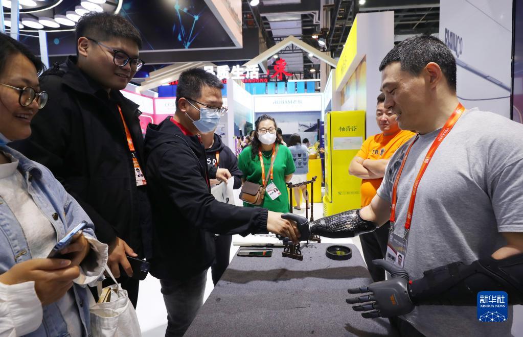 5月10日,在浙江省品牌推介展臺上,參觀(guān)者與安裝腦機科技操控假肢的工作人員握手。