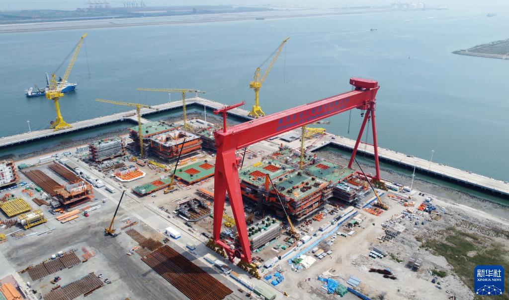 5月10日拍攝的渤中19-6凝析氣田一期開(kāi)發(fā)項目平臺建造現場(chǎng)(無(wú)人機照片)。