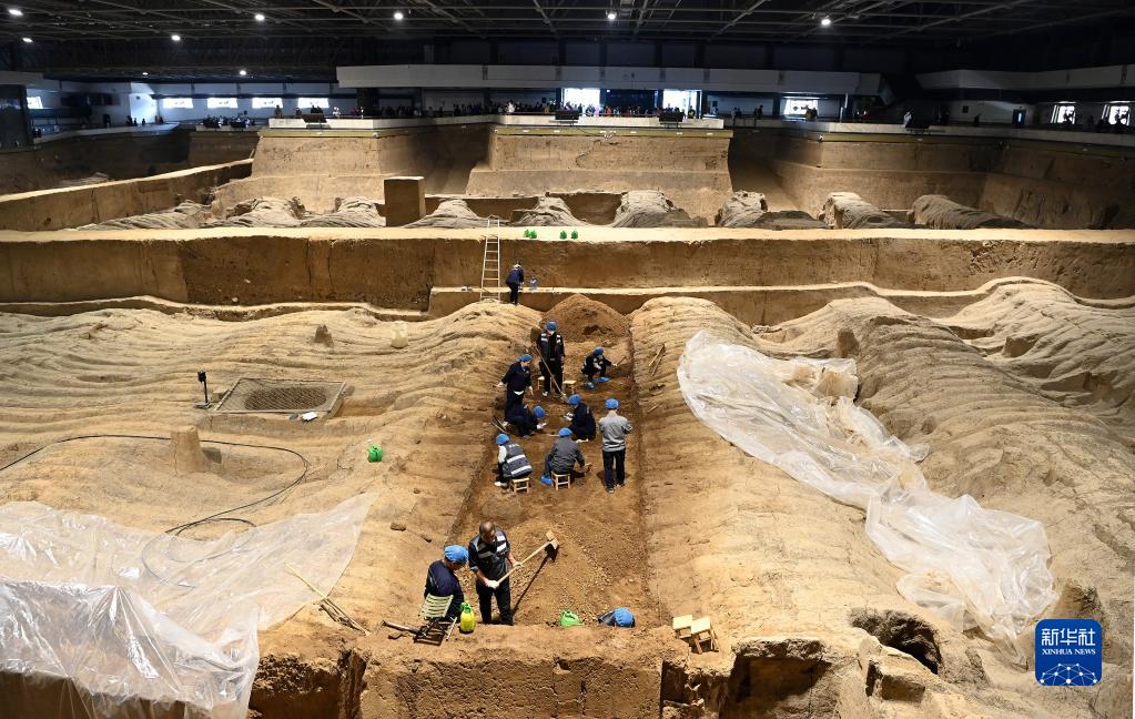 工作人員在秦兵馬俑二號坑遺址進(jìn)行發(fā)掘工作(4月26日攝)。