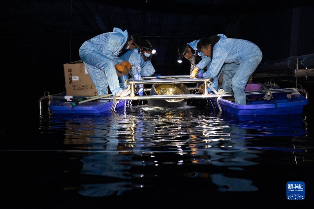 工作人員在水切倫科夫探測器陣列水池里更換實(shí)驗設備(4月21日攝)。