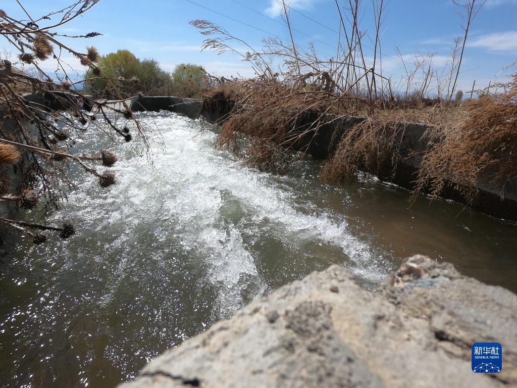 這是4月24日在吉爾吉斯斯坦卡拉奧伊村拍攝的一處經(jīng)中國援建灌溉工程改造后的水渠。