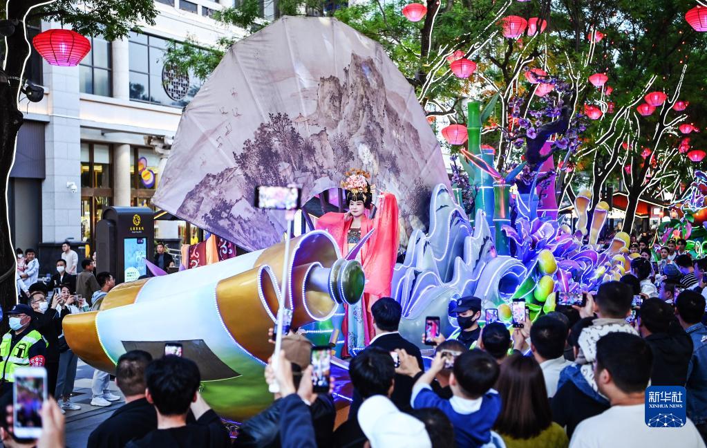 西安大唐不夜城進(jìn)行的花車(chē)巡游(4月25日攝影)。