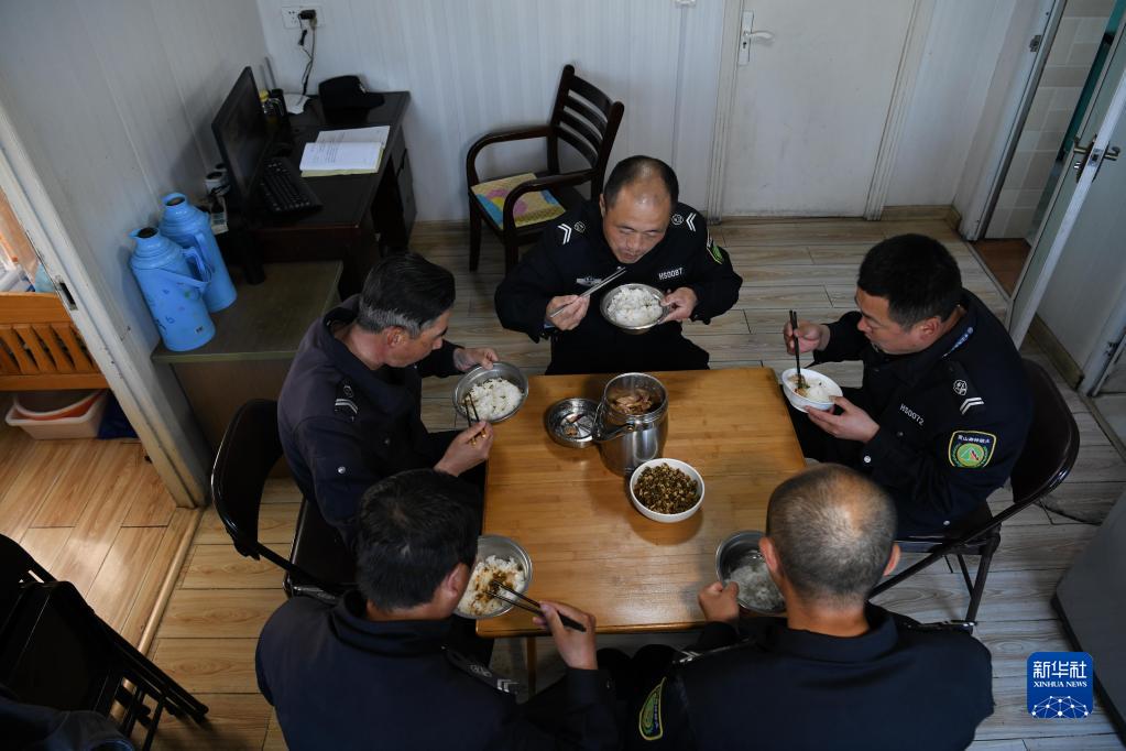 4月20日,在黃山風(fēng)景區平天矼瞭望哨內,瞭望哨防火小隊5名隊員在吃晚飯,右一為秦志平。