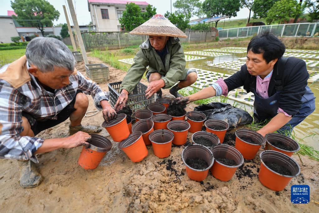 5月11日,在長(cháng)沙市望城區高塘嶺街道湘江村,農民將營(yíng)養土放入盆中。