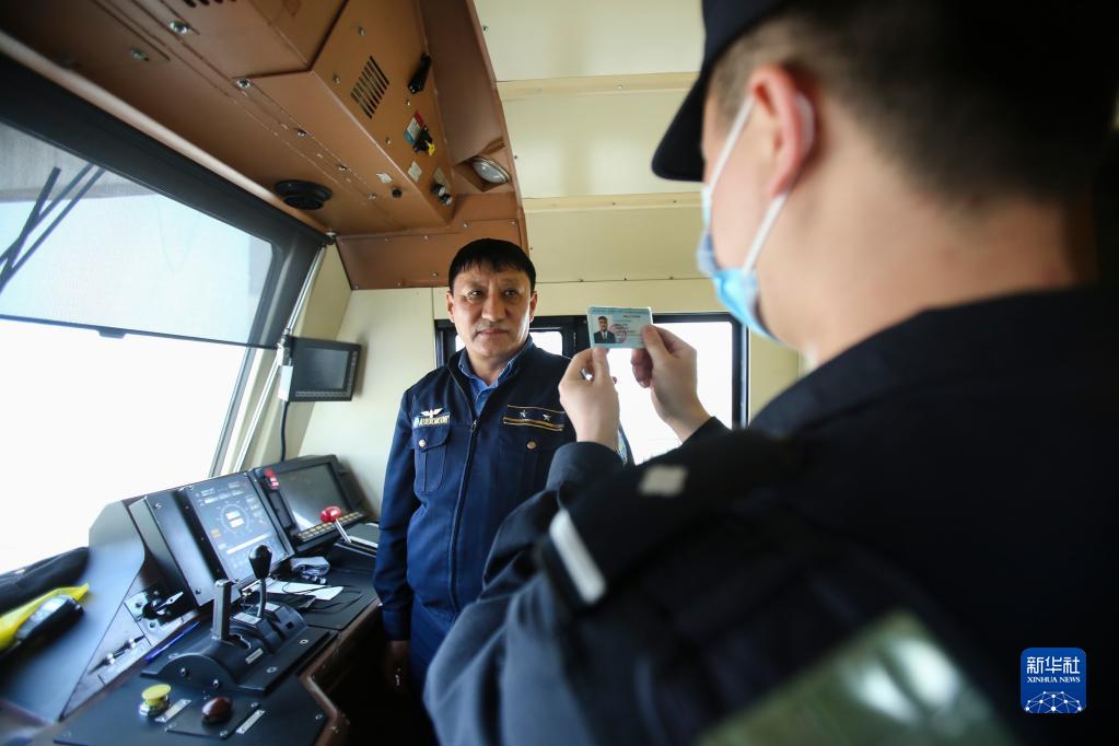 5月7日,在新疆霍爾果斯鐵路口岸,霍爾果斯出入境邊防檢查站執勤民警在對列車(chē)司機進(jìn)行人證對照。